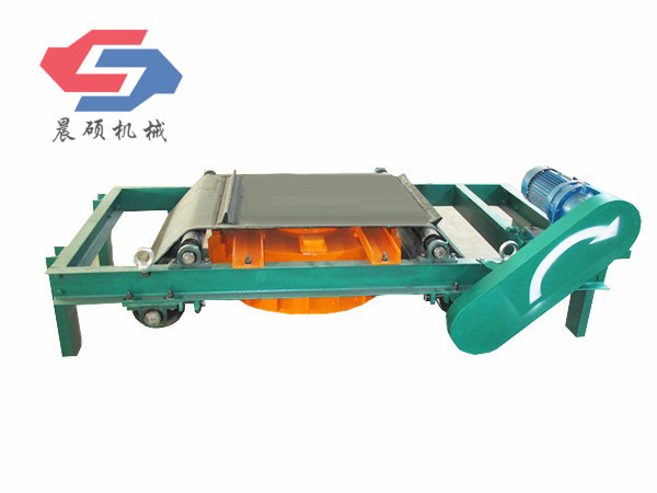 電磁除鐵器的基礎(chǔ)上增加了驅(qū)動(dòng)電機(jī)、滾筒、帶刮板的缷鐵膠帶等組成的缷鐵機(jī)構(gòu)。在工作過程